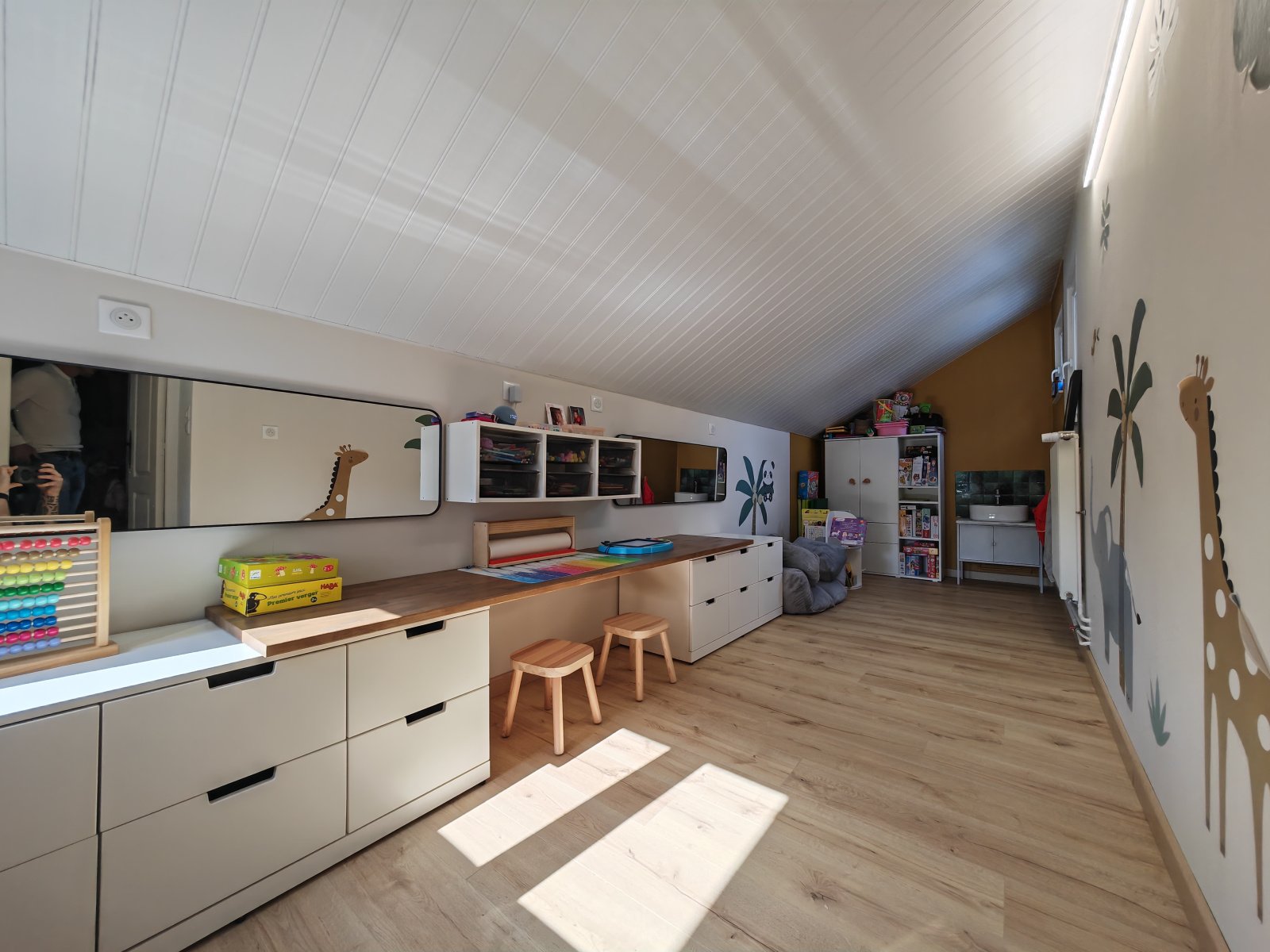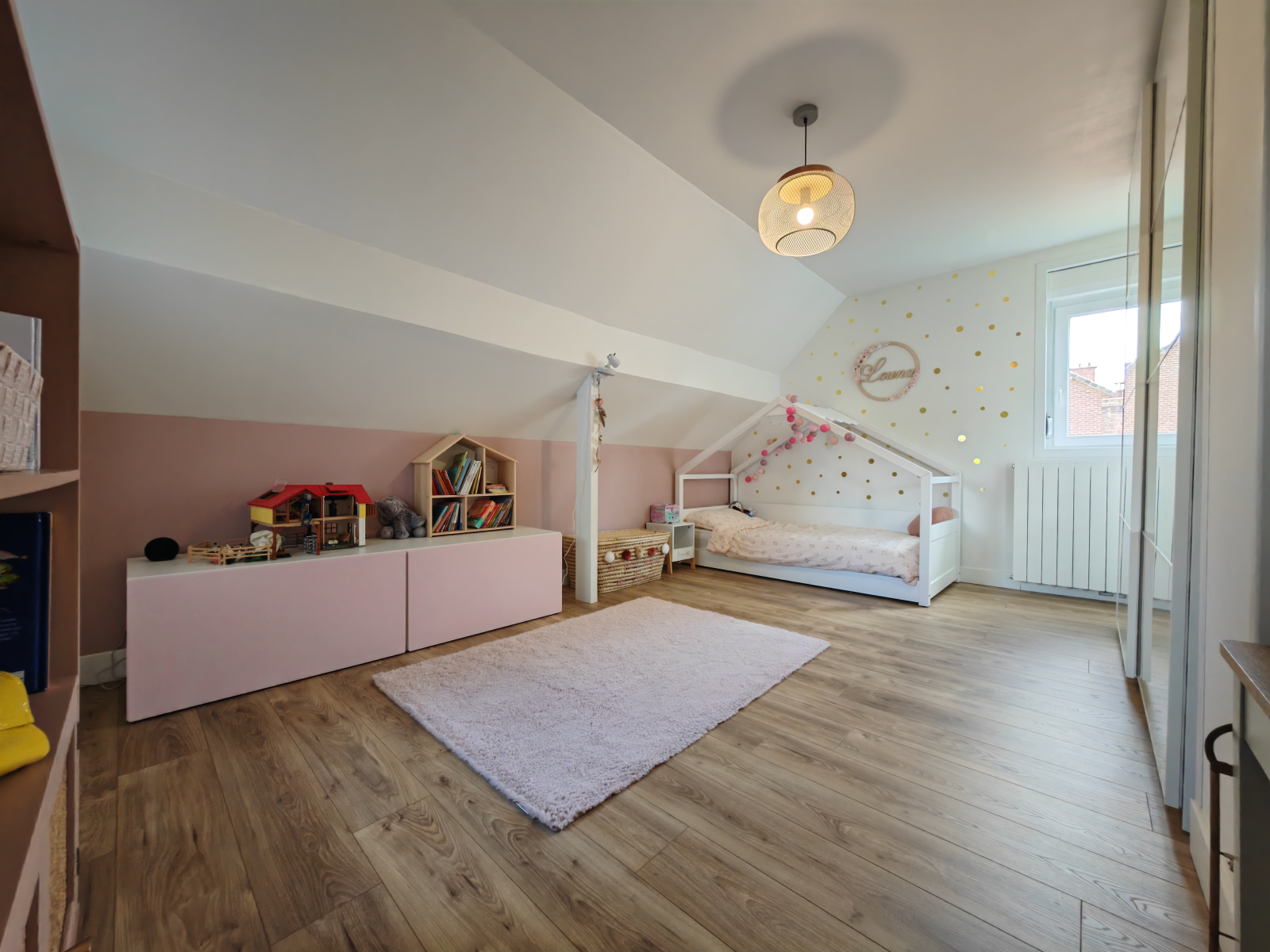 Elle comprend quatre chambres dont une au rez-de-chaussée, un espace jeux ou bureau, une buanderie, un grand salon-séjour, un second coin salon ainsi qu’une cuisine équipée et spacieuse.
