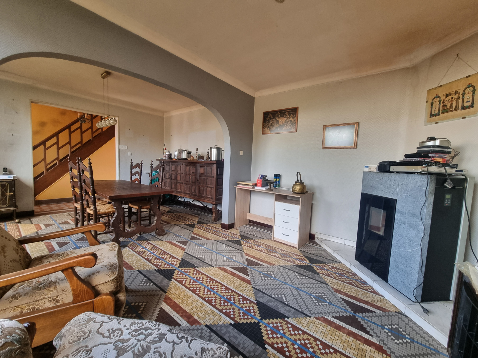 Cette maison offre un confort moderne avec une pompe à chaleur air-eau pour le chauffage, un poêle à pellets dans le salon-séjour, et des huisseries en double vitrage assurant une isolation optimale.