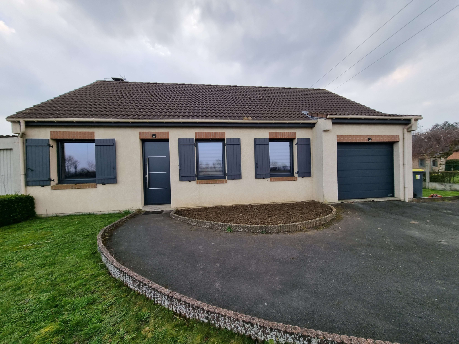 Plain pied individuel de 2003 comprenant cuisine équipée ouverte sur le salon-séjour, 3 chambres, salle de bains, garage, terrasse ainsi qu'un jardin.