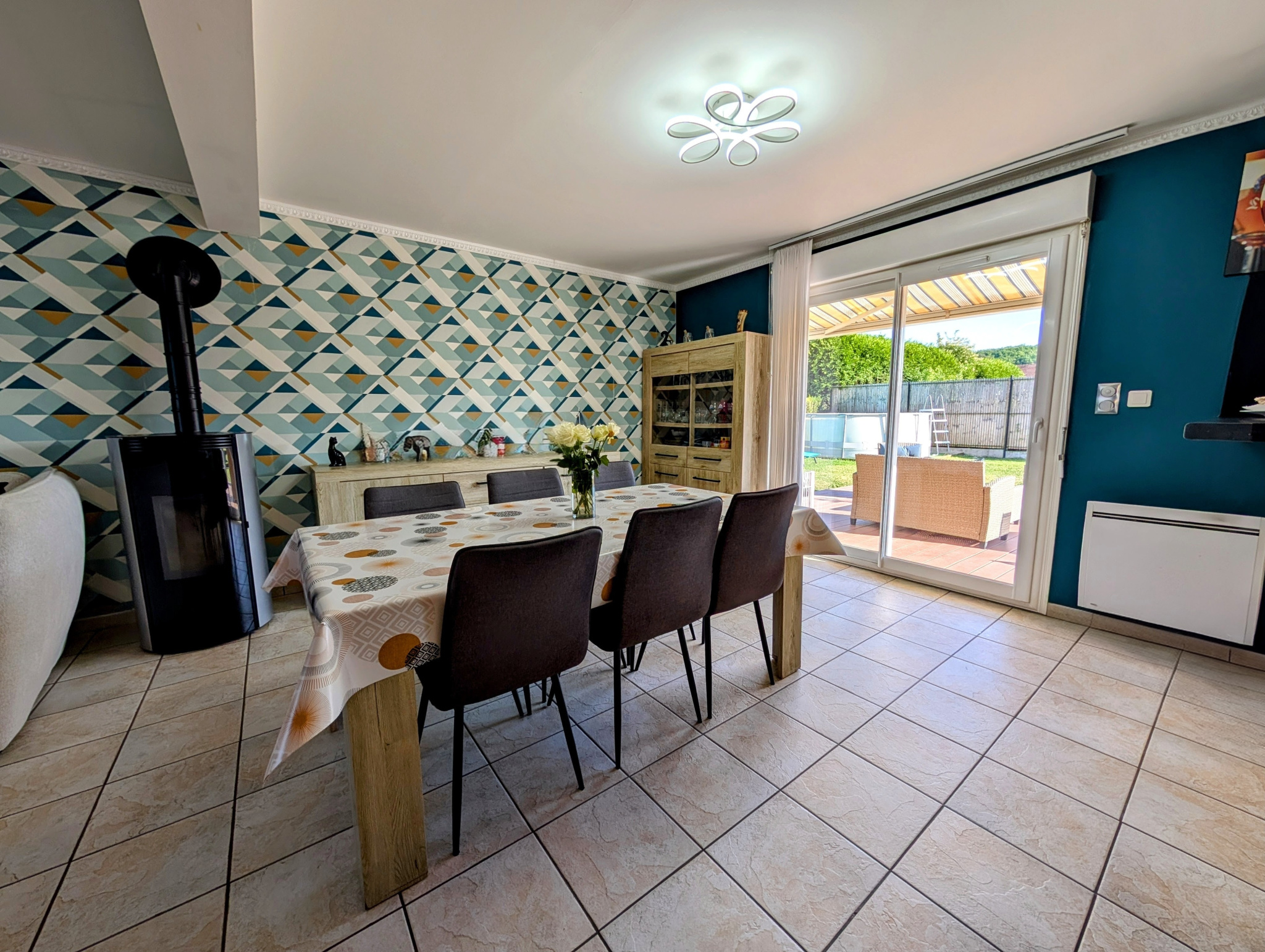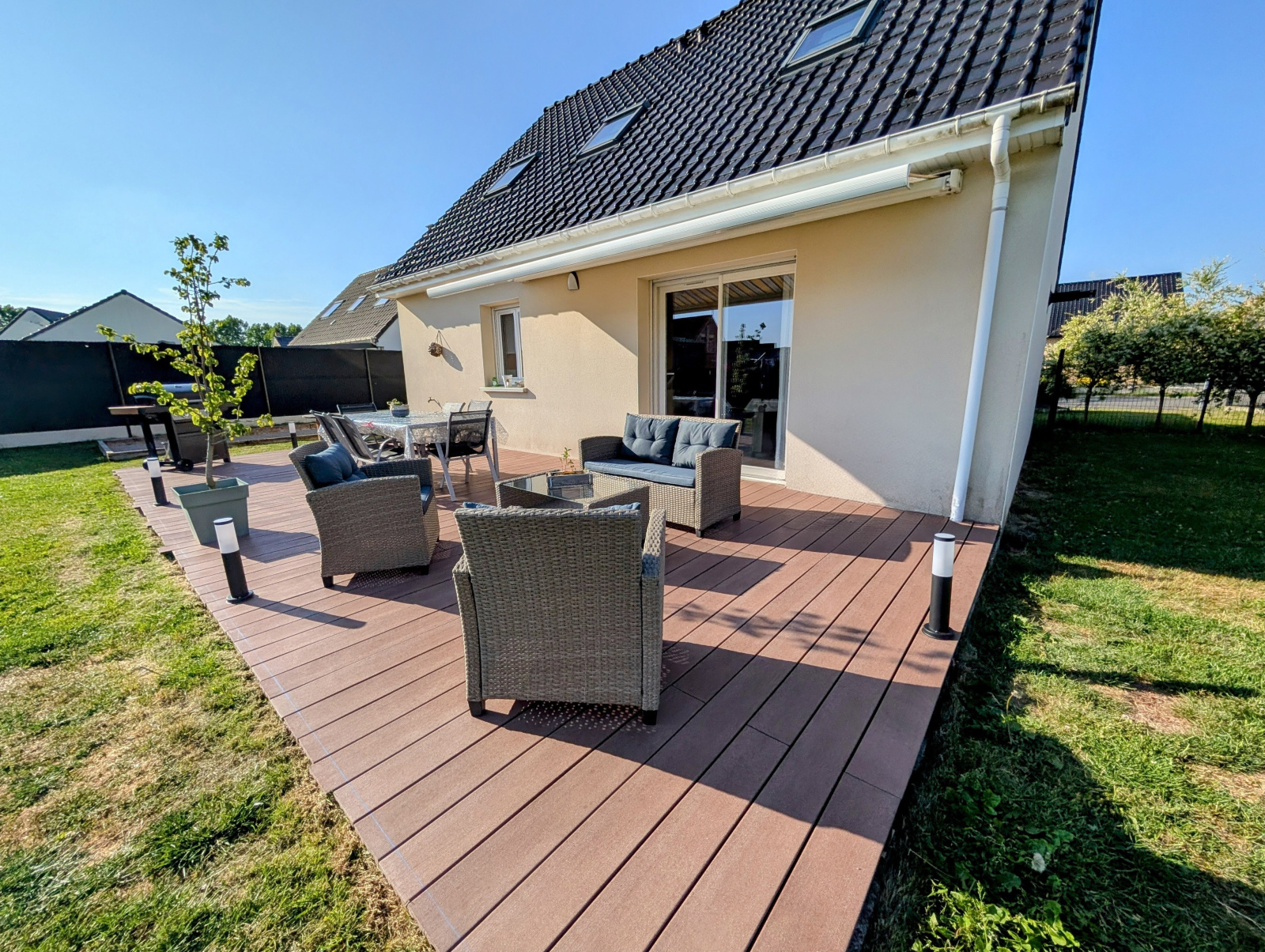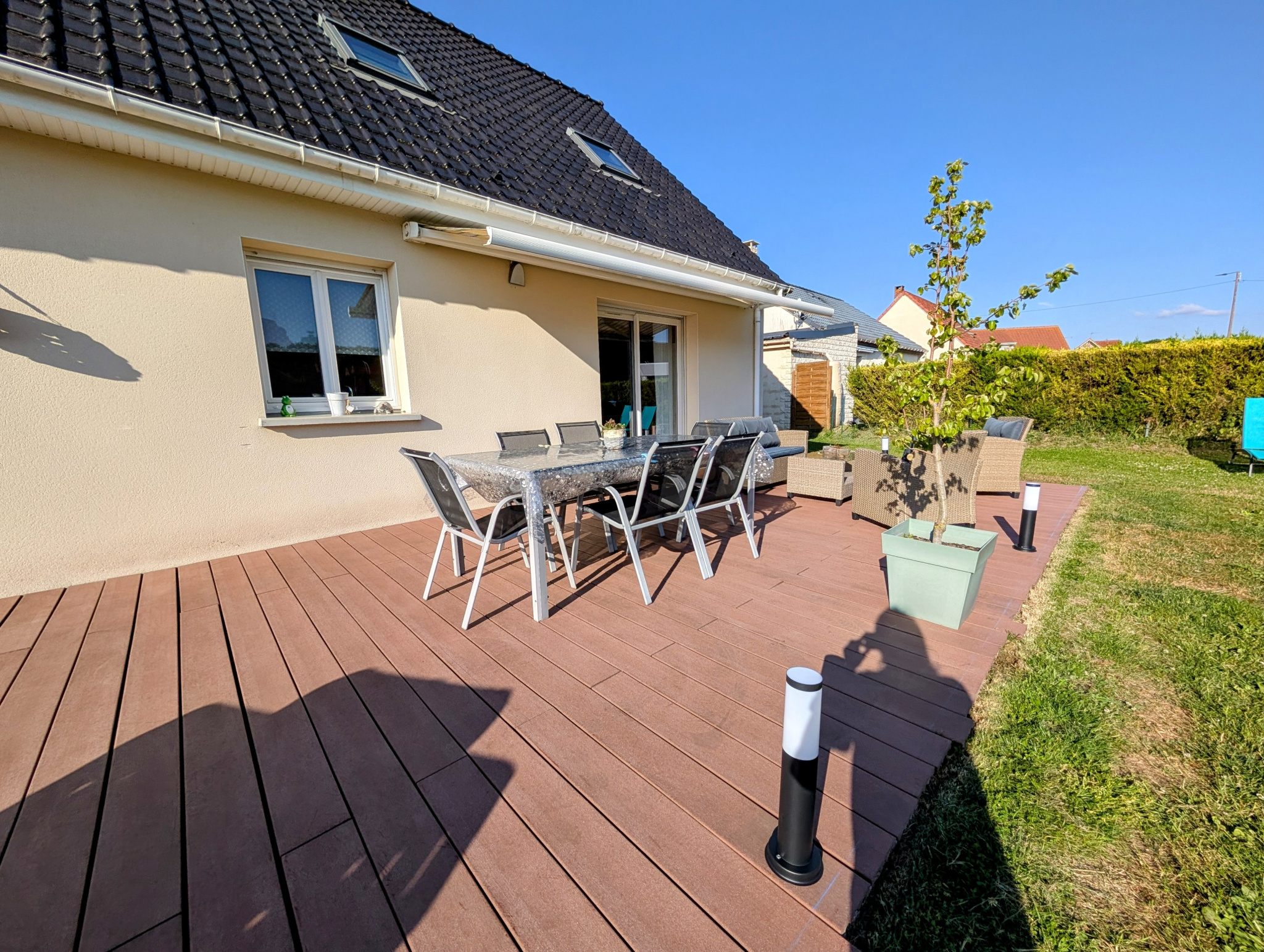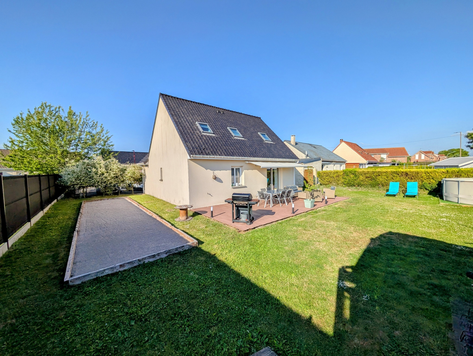 A l'extérieur un très beau jardin clos d'environ 500m² avec coin terrasse de 40m² plein Sud ; Une piscine hors-sol ; Un terrain de pétanque et un abri de jardin avec électricité.