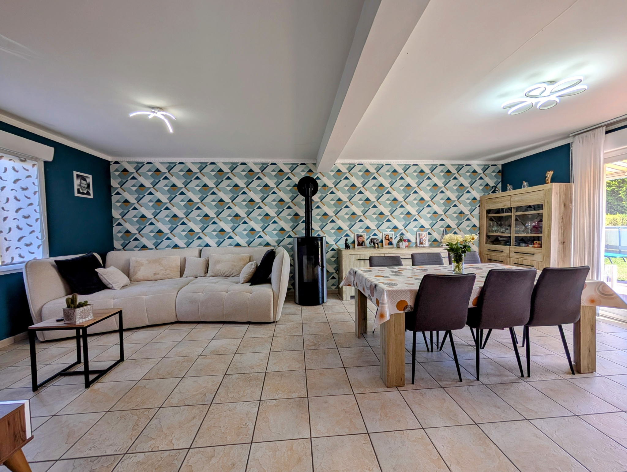Une belle entrée desservant une pièce à vivre de 40m² comprenant une partie séjour lumineux avec poêle à pellets et une cuisine équipée ; Un cellier avec espace buanderie ; WC séparé.